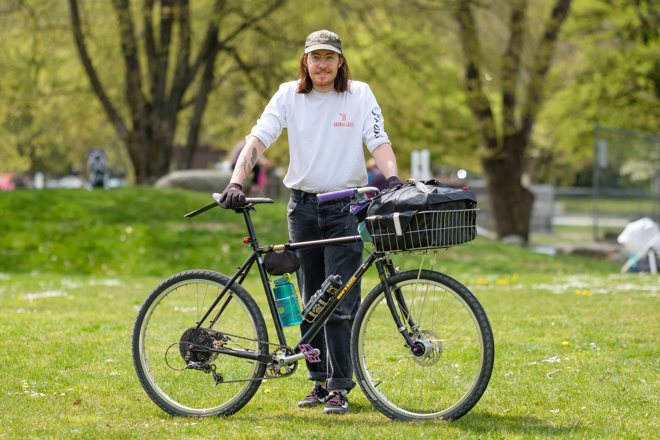 It’s always so rad to see someone progress and grow as a cyclist. It really does take time to find the riding, and the bike, you enjoy most. Watching Eric roll up with a vintage road bike, and then grabbing a vintage mtb, to finally arrive at a modern touring bike has been a great enjoyment for us. For the time being, Eric has landed here with their new Bassi Hog’s Back basket bike. This thing is a beautiful example of the functional aesthetic. This build has a lot of parts purchased here at Crows, with some Blue Lug swag sprinkled in, and a lot of the build work was done by Eric together with their friend, Tom, who’s also a great customer and friend of the shop. They’re both here every week for the #murderofcrows Social Ride and contribute a ton to the vibrant Crows community. This build rocks a lot of highly functional parts intertwined with some beautiful and elegant pieces. The drivetrain is the dependable and affordable Microshift Advent X wide range one-by, and the build is rolling on a set of Velo Orange Voyager Rims laced up to a Bitex hub in the back and a Shimano Alfine dynamo hub up front. That wheelset is a tried and true classic that we build up one a pretty regular basis. A highlight, though hard to find behind that MASSIVE Swift Industries Motherloaf bag, is the White Industries EC34, USA made headset. All in all, the bike is just the right amount of burly and just the right amount of elegant we think and as Jeremy likes to say: “It’s a beautiful bike for a beautiful person.” Thanks for working with us, Eric!